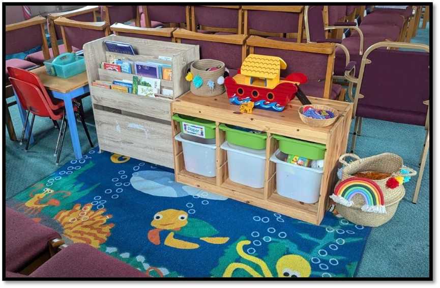 We have bags of toys at the back of church that you’re welcome to borrow and take to your seat. There is also a preschool area at the back of church, where families can sit together with their child. This space includes stories, ribbons, crayons, and toys, allowing little ones to move and play while still being part of the service.